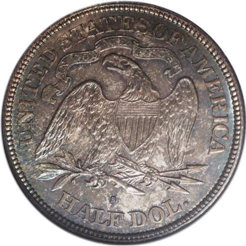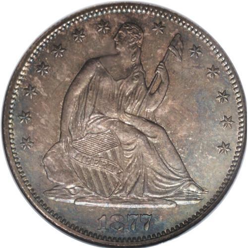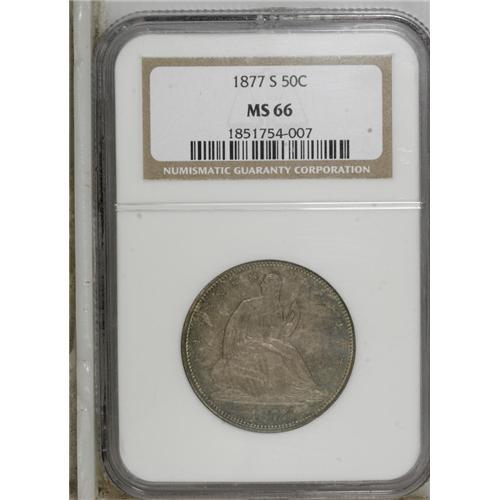 <B>1877-S 50C MS66 NGC.</B></I> Type One Reverse. The generous mintages of the 1877 P- and S-mint issues both ensured a supply of top-notch survivors and perhaps also served as a harbinger of things to come: Never again would Seated Liberty half dollar mintages approach those levels, and the 1878-S half is a legendary rarity in the Seated half dollar series. Much prooflikeness is visible underneath the lush toning that features shades of jade-green and ice-blue on each side. The strike is basically <I>full,</B></I> a feature that is seldom seen on these large coins, and close scrutiny reveals virtually no evidence of contact, save for a single small mark on the cheek. A top-of-the-line example. Census: 18 in 66, 3 finer (1/07).<BR><BR><b>Shipping:</b> Coins & Currency (<a target="_blank" href="http://www.heritageauctions.com/common/shipping.php">view shipping information</a>)