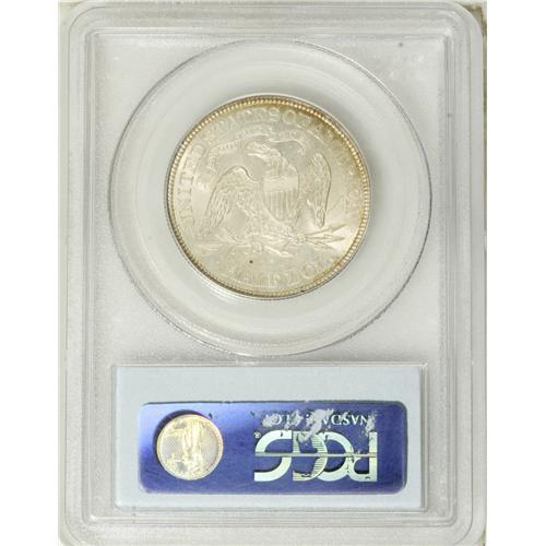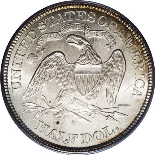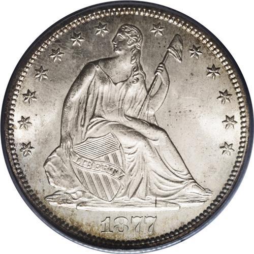 <B>1877-S 50C MS66 PCGS.</B></I> Type Two Reverse. WB-104, R.3. This appears to be Randy Wiley and Bill Bugert's WB-104: "Tail hub variety 2, with very small mintmark" variety as illustrated on page 207 of their book <I>The Complete Guide to Liberty Seated Half Dollars.</B></I> Wiley and Bugert call the WB-104 an R.1 overall, but note in Mint State grades that it is R.3 as is the 1877-S half dollar overall. The overall mintage is listed as 5,356,000 coins. This specimen is a bright, frosty Gem with a little incipient gold toning at the peripheries, and is exquisitely struck, with excellent delineation visible on virtually <I>all</B></I> of the design elements. A small toning spot in the field above the A in HALF identifies this particular specimen. Population: 11 in 66, 1 finer (10/06).<BR><BR><b>Shipping:</b> Coin/Currency (<a target="_blank" href="http://www.heritageauctions.com/common/shipping.php">view shipping information</a>)