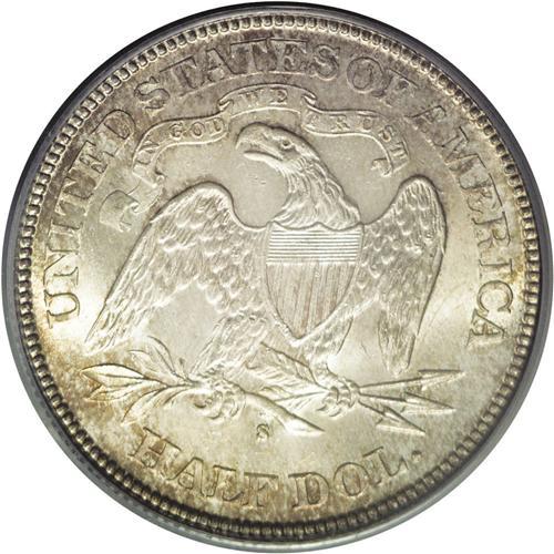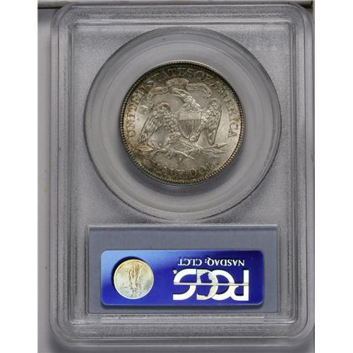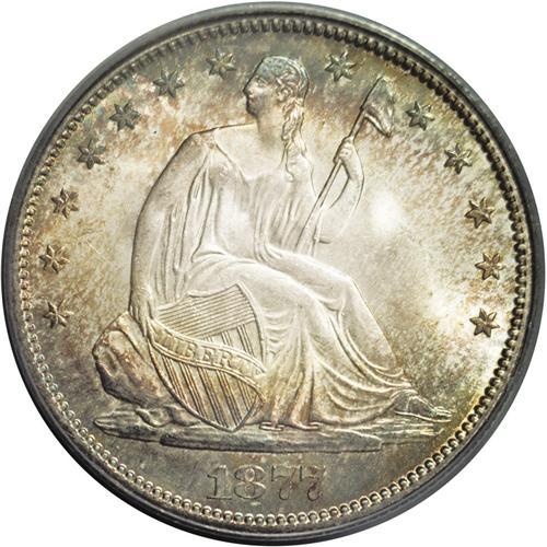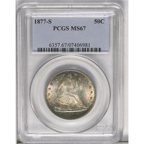 <B>1877-S<50C> MS67 PCGS.</B></I> Type Two Reverse. A Superb Gem with gorgeous peripheral gold and iridescent toning around ivory centers on both sides. The obverse includes some pale blue-green and lilac color. A few diagonal striations are present across Liberty's leg, the result of drawing the planchet stock to the required thickness for coining. In addition to these Mint caused marks, a few tiny abrasions are also present. This is the only MS67 example certified by PCGS (5/06) with none finer, and it was apparently just graded.