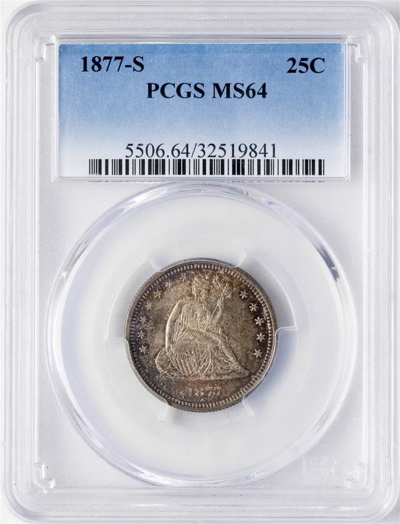 One 1877-S Seated Liberty Quarter Coin PCGS MS64. PCGS Graded.