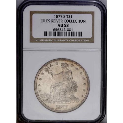1877-S T$1 AU58 NGC. Appealing golden toning. Nearly a 1877-S[T$1] AU58 NGC.