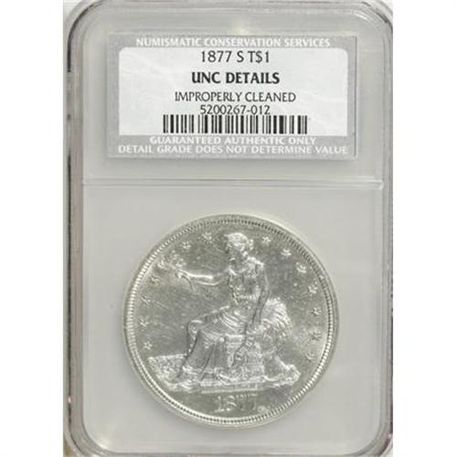 <B>1877-S T$1 --Improperly Cleaned--NCS. Unc Details.</B></I> NGC Census: (0/0). PCGS Population (0/0). Mintage: 9,519,000. (#7046)<BR><BR><B>Coin Engraver:</B> William Barber<BR><BR><b>Shipping:</b> Coins & Currency (<a target="_blank" href="http://www.heritageauctions.com/common/shipping.php">view shipping information</a>)