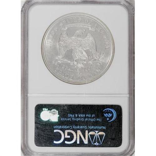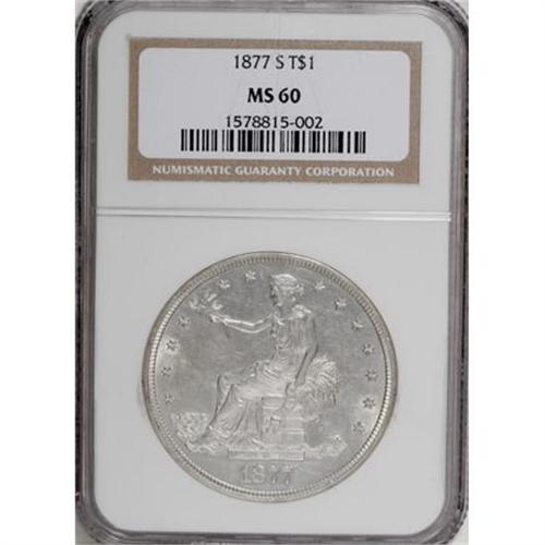 <B>1877-S T$1 MS60 NGC.</B></I> Pleasingly detailed for this San Francisco issue, with shining silver-white surfaces and no trace of wear. A number of scattered marks and wispy abrasions affect the fields and devices.<BR><I>From The Mario Eller Collection, Part Two.</B></I><BR><BR><B>Coin Engraver:</B> William Barber<BR><BR><b>Shipping:</b> Coins & Currency (<a target="_blank" href="http://www.heritageauctions.com/common/shipping.php">view shipping information</a>)