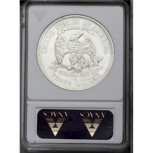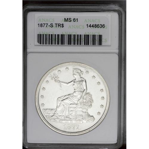 <B>1877-S<T$1> MS61 ANACS.</B></I> Bright, frosty and untoned, this snow-white example is well struck and shows a number of wispy hairlines and a few small abrasions on each side. The mintmark leans to the left. <BR><BR><B>Important notice:</B> Heritage usually auctions material at the rate of 200-250 lots per hour. On some occasions eBay Live bid software or the Internet may not be able to keep up with the pace of the auction. We recommend placing a realistic absentee bid now as insurance to avoid disappointment. Occasionally the auctioneer may eliminate or reject an eBay Live bid, and the auctioneer may also reopen a lot after the close of the eBay live bidding (usually because we missed an audience bid), and may reject your bid even if it shows you as the winning bidder. By bidding via eBay Live, you agree that Heritage may award the lot to another bidder at its sole discretion under the circumstances described above or any other reasonable circumstances. Since eBay bids are not shown to us until we open the lot on the floor, we treat those bids just like floor bids. In most cases the floor responds before the eBay bid is presented to us, due to Internet lag time, so for consistency we have made it a policy that floor bids are always considered first over tie eBay live bids. Also please note that all Heritage lots purchased through eBay Live carry a 20% Buyer's Premium. Please make sure you read the Terms and Conditions before you bid. This lot is being auctioned in conjunction with a live floor auction by Heritage Galleries & Auctioneers. All final auction and invoice information will be supplied by Heritage Galleries & Auctioneers, and all other information should be considered preliminary. Lot:2227 <BR><BR><B>Winning Notification and Billing:</B> After the FINAL session in this auction is complete, Heritage will send e-mail and snail mail invoices. This process normally takes several days. All final auction and invoice information will be supplied by Heritage Galleries & Auctioneers, and all other information should be considered preliminary. <BR><BR>This auction will be conducted on a live auction floor and over the Internet through eBay Live. If you choose to place an absentee bid, please take a moment to <font color='#0000ff'><u><a href='http://pages.ebay.com/liveauctions/help/before/laabsentee.html'>learn how eBay Live absentee bidding works</a></u></font><font color='#000000'>