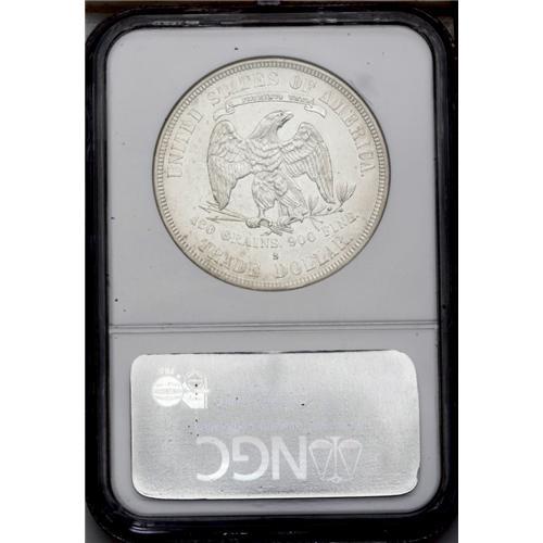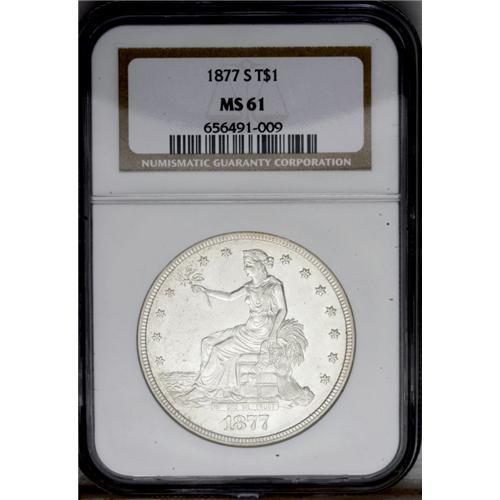 <B>1877-S<T$1> MS61 NGC.</B></I> An untoned example that features frosty devices and no obtrusive marks. A "Unicorn" variety; a short die scratch (as made) from Liberty's forehead resembles a horn. <BR><BR><B>Important notice:</B> Heritage usually auctions material at the rate of 200-250 lots per hour. On some occasions eBay Live bid software or the Internet may not be able to keep up with the pace of the auction. We recommend placing a realistic absentee bid now as insurance to avoid disappointment. Occasionally the auctioneer may eliminate or reject an eBay Live bid, and the auctioneer may also reopen a lot after the close of the eBay live bidding (usually because we missed an audience bid), and may reject your bid even if it shows you as the winning bidder. By bidding via eBay Live, you agree that Heritage may award the lot to another bidder at its sole discretion under the circumstances described above or any other reasonable circumstances. Since eBay bids are not shown to us until we open the lot on the floor, we treat those bids just like floor bids. In most cases the floor responds before the eBay bid is presented to us, due to Internet lag time, so for consistency we have made it a policy that floor bids are always considered first over tie eBay live bids. Also please note that all Heritage lots purchased through eBay Live carry a 20% Buyer's Premium. Please make sure you read the Terms and Conditions before you bid. This lot is being auctioned in conjunction with a live floor auction by Heritage Galleries & Auctioneers. All final auction and invoice information will be supplied by Heritage Galleries & Auctioneers, and all other information should be considered preliminary. Lot:2226 <BR><BR><B>Winning Notification and Billing:</B> After the FINAL session in this auction is complete, Heritage will send e-mail and snail mail invoices. This process normally takes several days. All final auction and invoice information will be supplied by Heritage Galleries & Auctioneers, and all other information should be considered preliminary. <BR><BR>This auction will be conducted on a live auction floor and over the Internet through eBay Live. If you choose to place an absentee bid, please take a moment to <font color='#0000ff'><u><a href='http://pages.ebay.com/liveauctions/help/before/laabsentee.html'>learn how eBay Live absentee bidding works</a></u></font><font color='#000000'>