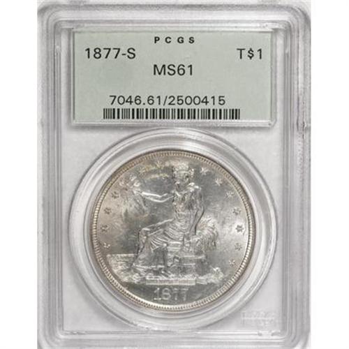 <B>1877-S T$1 MS61 PCGS.</B></I> PCGS Population (112/518). NGC Census: (136/417). Mintage: 9,519,000. Numismedia Wsl. Price for NGC/PCGS coin in MS61: $900. (#7046)<BR><BR><B>Coin Engraver:</B> William Barber<BR><BR><b>Shipping:</b> Coins & Currency (<a target="_blank" href="http://www.heritageauctions.com/common/shipping.php">view shipping information</a>)