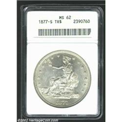 1877-S T$1 MS62 ANACS. Sharply defined and mostly brilliant with bright underlying mint frost. Lightly abraded. Important notice: We expect to be auctioning lots at the rate of 200-250 per hour. Sometimes eBay Premier live bid software cannot keep up with that pace, so we strongly recommend that you place a realistic proxy bid now as insurance to avoid disappointment. Also please note that all Heritage/CAA lots purchased through eBay Premier carry a 20% Buyer's Premium. Please make sure you read the Terms and Conditions.