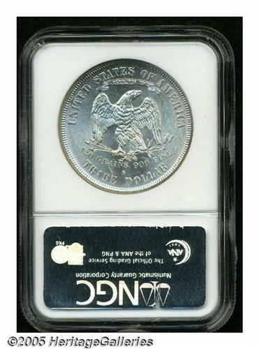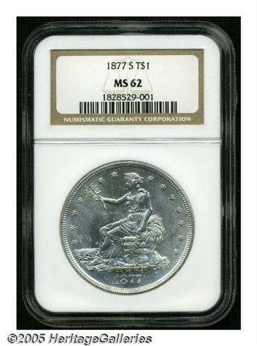 <B>1877-S<T$1> MS62 NGC.</B></I> Breen-5811. A well struck, lustrous, and nearly untoned representative that has formidable eye appeal for the given grade. A couple of short pinscratches at 10 o'clock on the reverse. Broken right foot on the R in DOLLAR. PLURIBUS UNUM and AMERICA are nicely die doubled.