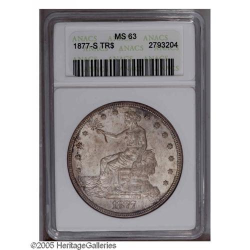 1877-S T$1 MS63 ANACS. Well struck, except for Liberty 1877-S[T$1] MS63 ANACS.