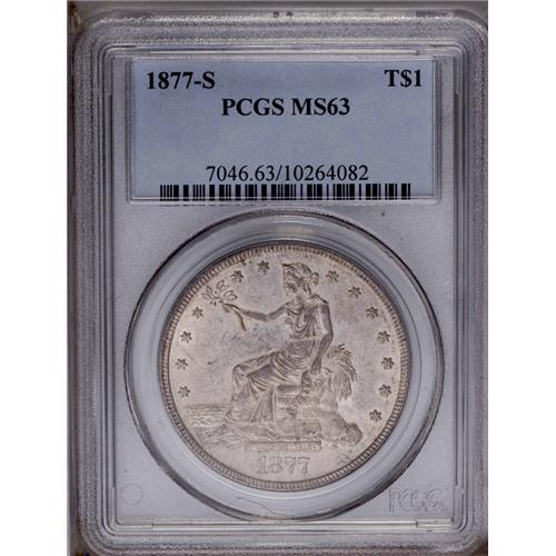 <B>1877-S<T$1> MS63 PCGS.</B></I> A fully lustrous Mint State example with pale violet color over satiny silver surfaces. A few scattered surface marks are consistent with the grade.