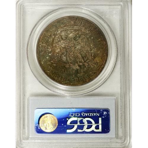 <B>1877-S T$1 MS63 PCGS.</B></I> Light powder-gray and russet patina on the obverse cedes on the reverse to cerise, aqua, and ice-blue. This well-struck piece reveals a few light abrasions under a glass, all undistracting and well hidden under the toning.<BR><BR><b>Shipping:</b> Coin/Currency (<a target="_blank" href="http://www.heritageauctions.com/common/shipping.php">view shipping information</a>)