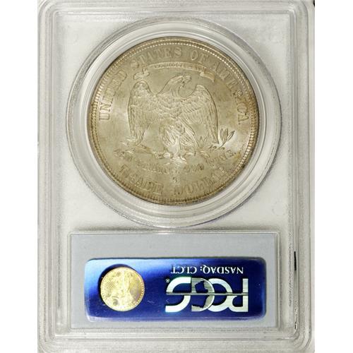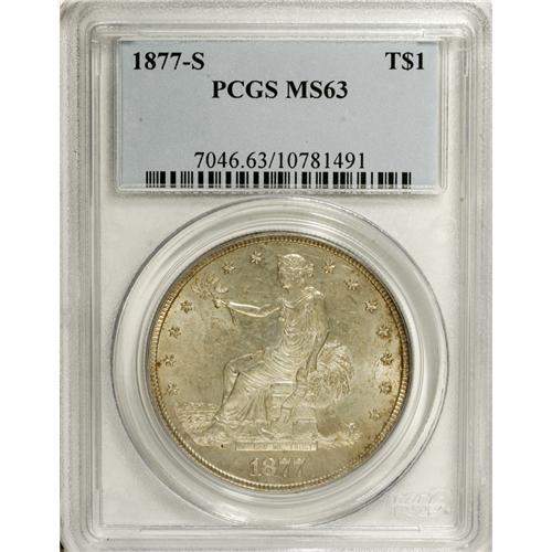 <B>1877-S T$1 MS63 PCGS.</B></I> Pale gold-gray overall with small spots of violet and a brick-red streak at the ERI of AMERICA. Well struck with pretty luster, though the fields exhibit light abrasions.<BR><BR><b>Shipping:</b> Coins & Currency (<a target="_blank" href="http://www.heritageauctions.com/common/shipping.php">view shipping information</a>)