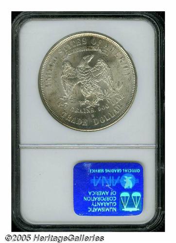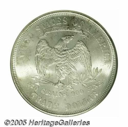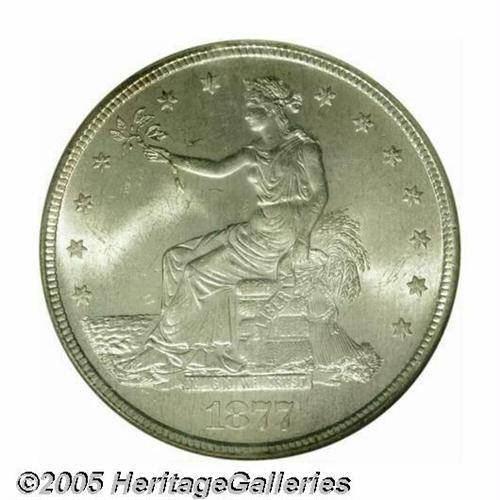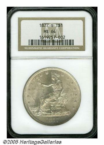 <B>1877-S<T$1> MS64 NGC.</B></I> Brilliant and lustrous. A few of the obverse stars are a bit flatly struck, but most other design features show bold definition. A nice example suitable for inclusion in either a high-grade type collection or an extraordinary date set.