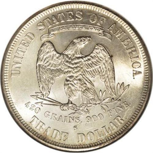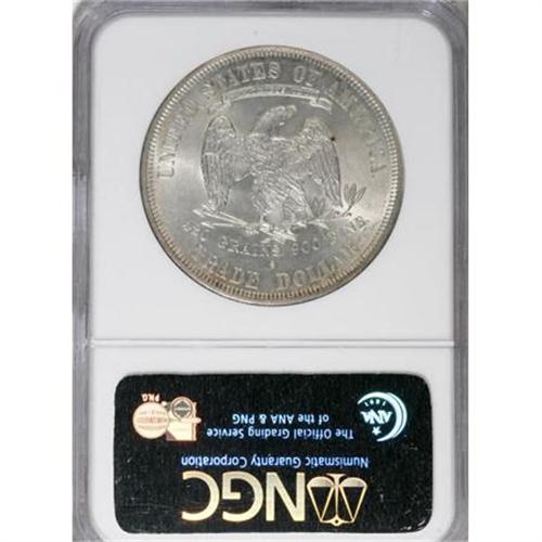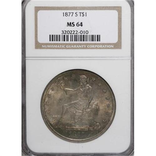 <B>1877-S T$1 MS64 NGC.</B></I> This high mintage Trade dollar had more than 9.5 million pieces produced. It is relatively available in mint condition and even higher grade examples are occasionally found. This is an exceptional coin that is an interesting study in contrasts. Fully struck throughout, the obverse has medium density rose-golden toning while the reverse is almost free from toning. Pleasing soft mint frost swirls around each side of this lovely type coin. <BR><BR><B>Coin Engraver:</B> William Barber<BR><BR><b>Shipping:</b> Coins & Currency (<a target="_blank" href="http://www.heritageauctions.com/common/shipping.php">view shipping information</a>)