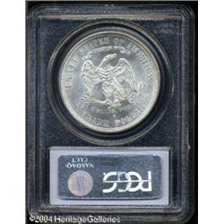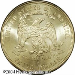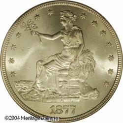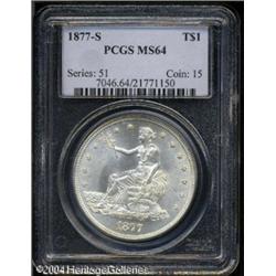 1877-S T$1 MS64 PCGS. A Choice, completely untoned <B>1877-S T$1 MS64 PCGS.</B></I> A Choice, completely untoned example that, except for a few isolated milling marks, is remarkably smooth for a business strike Trade Dollar. Even with close examination, one might wonder why this is only in an MS64 holder. <BR><BR><B>Important notice:</B> Heritage usually auctions material at the rate of 200-250 lots per hour. On some occasions eBay Live bid software or the Internet may not be able to keep up with the pace of the auction. We recommend placing a realistic absentee bid now as insurance to avoid disappointment. Occasionally the auctioneer may eliminate or reject an eBay Live bid, and the auctioneer may also reopen a lot after the close of the eBay live bidding (usually because we missed an audience bid), and may reject your bid even if it shows you as the winning bidder. By bidding via eBay Live, you agree that Heritage may award the lot to another bidder at its sole discretion under the circumstances described above or any other reasonable circumstances. Since eBay bids are not shown to us until we open the lot on the floor, we treat those bids just like floor bids. In most cases the floor responds before the eBay bid is presented to us, due to Internet lag time, so for consistency we have made it a policy that floor bids are always considered first over tie eBay live bids. Also please note that all Heritage lots purchased through eBay Live carry a 20% Buyer's Premium. Please make sure you read the Terms and Conditions before you bid. This lot is being auctioned in conjunction with a live floor auction by Heritage Galleries & Auctioneers. All final auction and invoice information will be supplied by Heritage Galleries & Auctioneers, and all other information should be considered preliminary. Lot:6410
