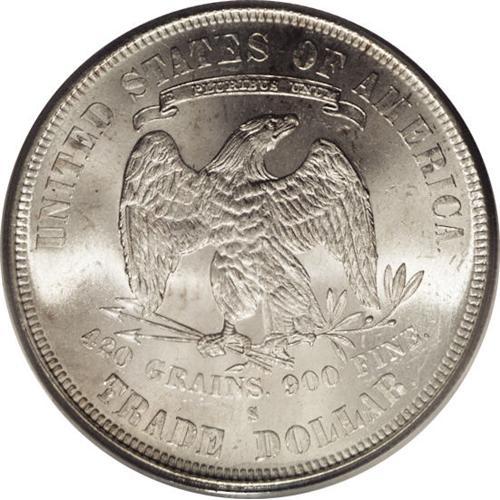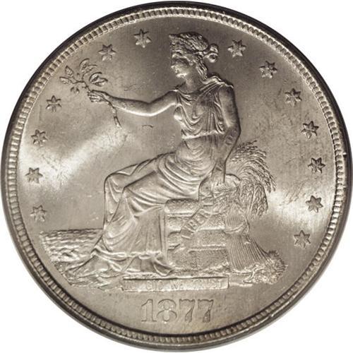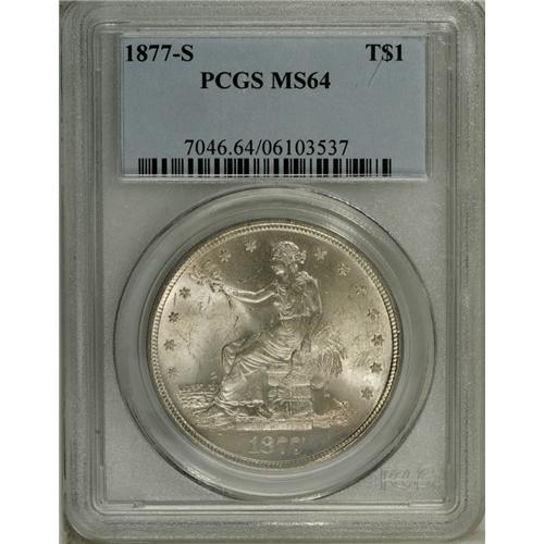 <B>1877-S T$1 MS64 PCGS.</B></I> Breen-5813. Large S, 1 8 Free. The most common variety according to Bowers' <I>Silver Dollar Encyclopedia.</B></I> Lovely examples in Gem grades are made possible through the record mintage, in excess of 9 million examples. This lovely piece is completely brilliant, with an appearance much more typical of a Morgan dollar than what comes to mind for Trade dollars. The strike is bold, the luster is radiant, and the few light ticks and abrasions are consistent with the near-Gem assessment.<BR><BR><b>Shipping:</b> Coin/Currency (<a target="_blank" href="http://www.heritageauctions.com/common/shipping.php">view shipping information</a>)
