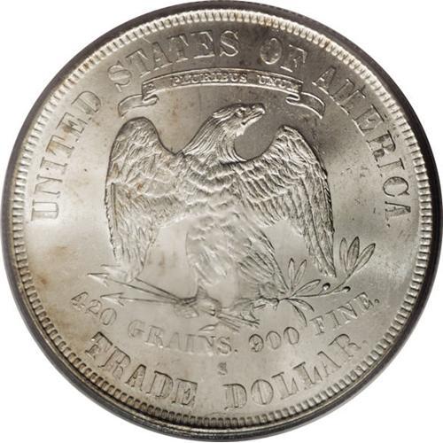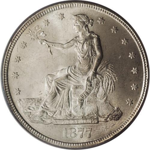 <B>1877-S T$1 MS64 PCGS.</B></I> Breen-5813. Large S, 1 8 Free. The most common variety according to Bowers' <I>Silver Dollar Encyclopedia.</B></I> Attractive specimens in high Mint State grades are made possible through the record mintage, in excess of 9 million examples. This lovely piece is nearly brilliant with a bold strike and radiant luster. The few marks are consistent with the near-Gem assessment.<BR><BR><b>Shipping:</b> Coins & Currency (<a target="_blank" href="http://www.heritageauctions.com/common/shipping.php">view shipping information</a>)
