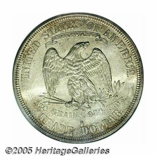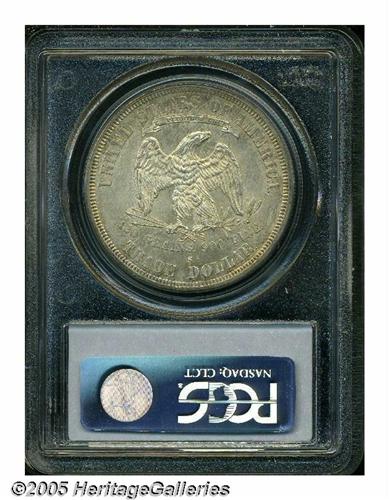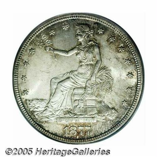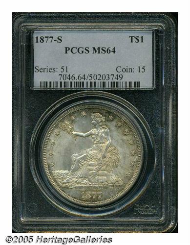 <B>1877-S<T$1> MS64 PCGS.</B></I> This coin is earmarked for inclusion in a near-Gem type set. The base color on both sides is silver-gray in shade over which mottled olive-russet toning has gathered toward the borders. The luster is full with a swirling frosty texture, and the nearly complete striking definition is uncommon for a survivor of this often poorly impressed type. Minimally abraded, as befits the grade.