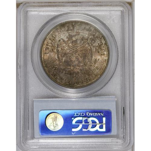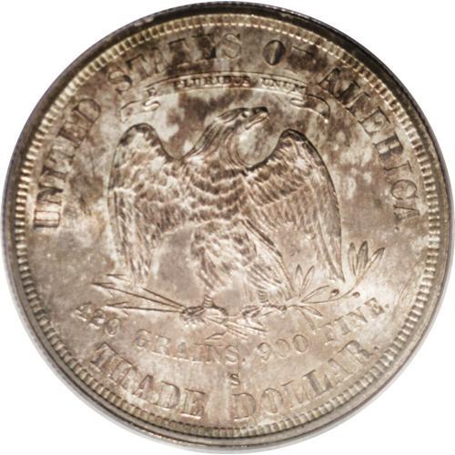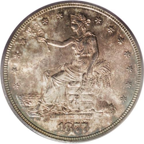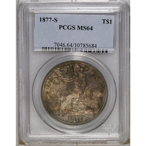<B>1877-S T$1 MS64 PCGS.</B></I> With its gargantuan mintage of 9,519,000 pieces, the 1877-S is the Trade dollar most often selected by type collectors. The present piece, with its dappled peach, rose, and navy-blue patina, is an excellent candidate for such a set. Well-preserved aside from a handful of light marks and solidly struck with attractive luster.<BR><BR><b>Shipping:</b> Coins & Currency (<a target="_blank" href="http://www.heritageauctions.com/common/shipping.php">view shipping information</a>)
