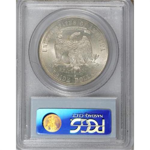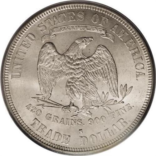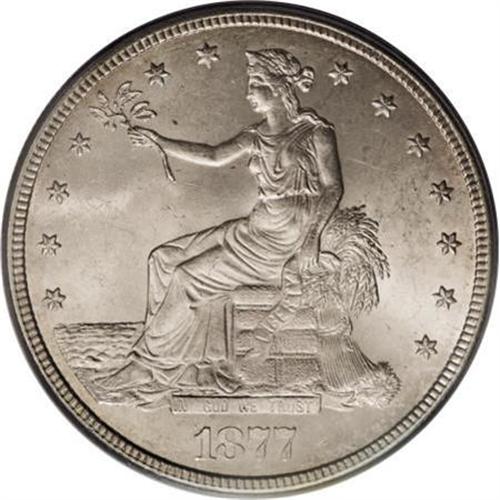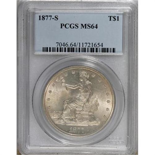 <B>1877-S T$1 MS64 PCGS.</B></I> Light autumn-gold toning embraces this highly lustrous and minimally abraded near-Gem. The reverse die is interesting for its cluster of fine die lines near the eagle's right (facing) leg. A crisply struck example from the penultimate year of circulation issue. As of (7/07), PCGS has certified a mere 30 pieces finer.<BR><BR><B>Coin Engraver:</B> William Barber<BR><BR><b>Shipping:</b> Coins & Currency (<a target="_blank" href="http://www.heritageauctions.com/common/shipping.php">view shipping information</a>)