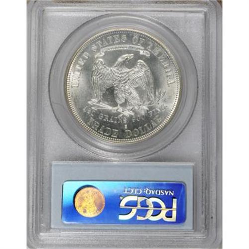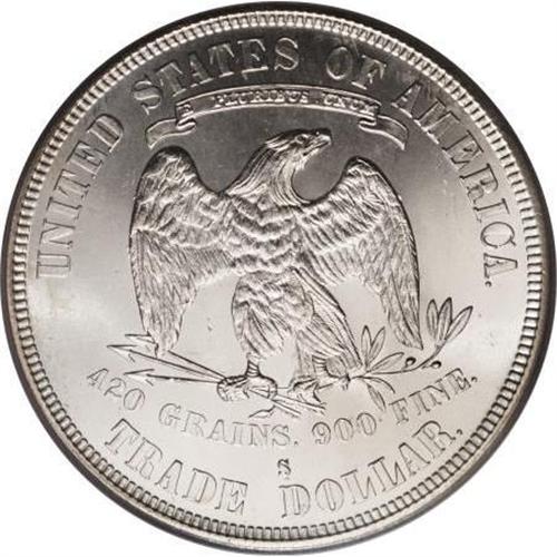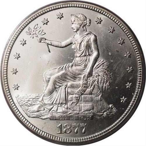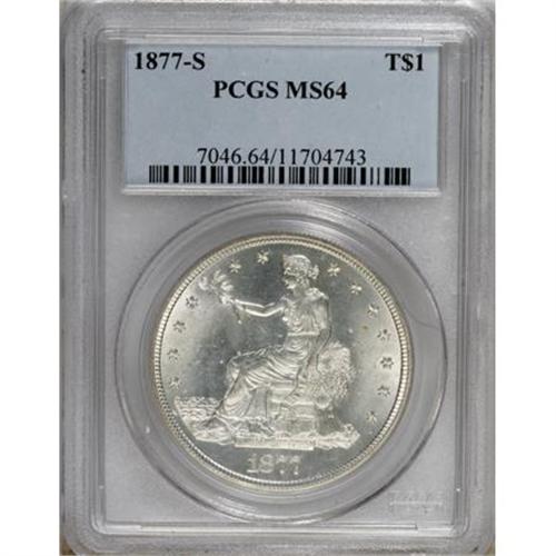 <B>1877-S T$1 MS64 PCGS.</B></I> A stone-white Trade dollar with dazzling luster and a meticulous strike. Even Liberty's hair and the eagle's ankle have exacting definition. Marks are inconsequential, and the grade appears conservative despite a small obverse spot equidistant from stars 9 and 10.<BR><BR><B>Coin Engraver:</B> William Barber<BR><BR><b>Shipping:</b> Coins & Currency (<a target="_blank" href="http://www.heritageauctions.com/common/shipping.php">view shipping information</a>)