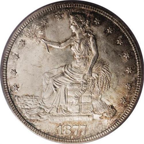 <B>1877-S T$1 MS64 PCGS.</B></I> Splashes of peripheral iridescence enhance the natural golden-ivory surfaces of this frosty silver trade dollar. All of the design elements are bold and the surfaces are pristine. The date is not difficult to locate in Choice Mint State grade, but is nearly impossible to find any finer. We consider an MS64 example of the 1877-S trade dollar to be an excellent value.<BR><BR><B>Coin Engraver:</B> William Barber<BR><BR><b>Shipping:</b> Coins & Currency (<a target="_blank" href="http://www.heritageauctions.com/common/shipping.php">view shipping information</a>)