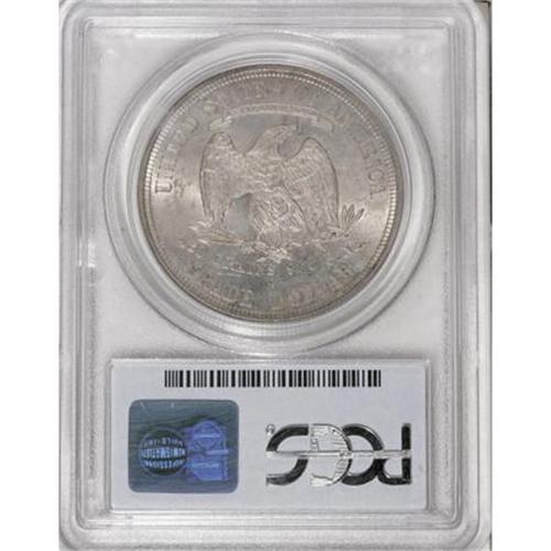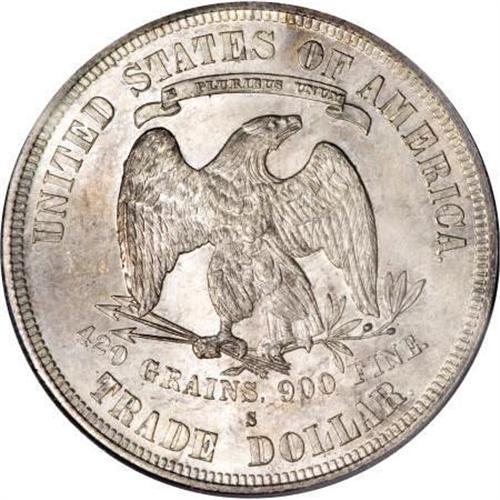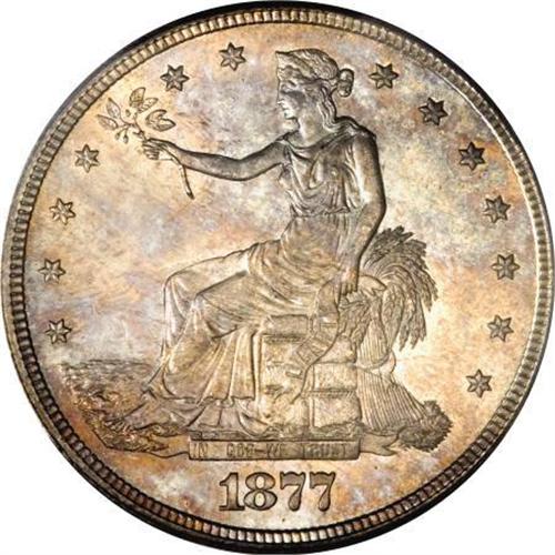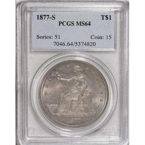 <B>1877-S T$1 MS64 PCGS.</B></I> With a substantial mintage of 9,519,000 pieces, the 1877-S Trade dollar is often selected by type collectors. The present piece, with its dappled peach, rose, and sky-blue patina, is an excellent candidate for such a set. Well-preserved aside from a handful of light marks and solidly struck with attractive luster. Infrequently encountered in Gem. Population: 148 in 64, 30 finer (12/07).<BR><I>From The Rare Coins of New Hampshire Collector Set.</B></I><BR><BR><B>Coin Engraver:</B> William Barber<BR><BR><b>Shipping:</b> Coins & Currency (<a target="_blank" href="http://www.heritageauctions.com/common/shipping.php">view shipping information</a>)