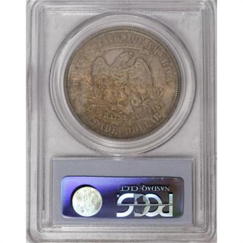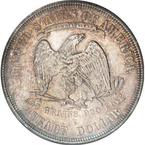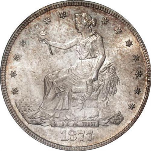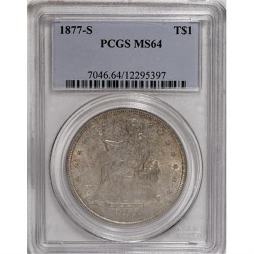 <B>1877-S T$1 MS64 PCGS.</B></I> Full head details and complete star radials attest to the sharp strike of this trade dollar. The obverse has satiny luster that is enhanced by speckled gold and iridescent toning. The reverse is deeper, with sold gold and ivory that are accented by peripheral blue toning. Struck from a lapped obverse die with the branch at upper left fragmented. PCGS has only certified 30 finer examples of the date.<BR><BR><B>Coin Engraver:</B> William Barber<BR><BR><b>Shipping:</b> Coins & Currency (<a target="_blank" href="http://www.heritageauctions.com/common/shipping.php">view shipping information</a>)