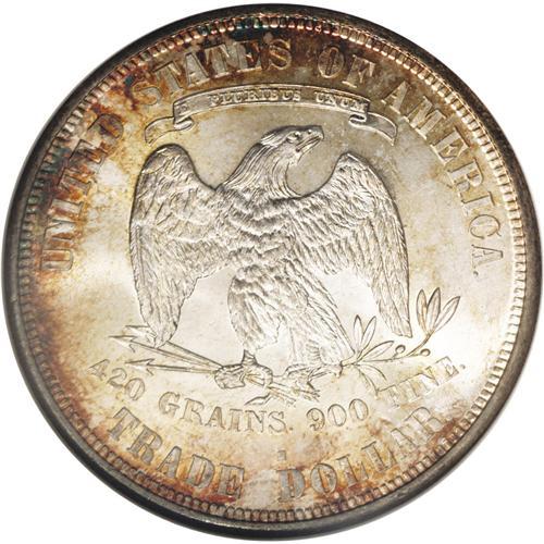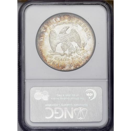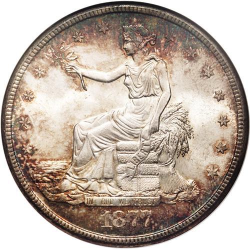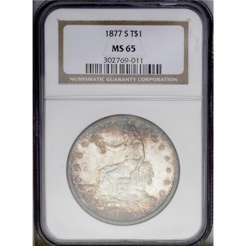 <B>1877-S<T$1> MS65 NGC.</B></I> Rich dappled reddish-orange and electric-turquoise coloration occurs on each side, primarily near the border areas, leaving the centers essentially untoned. Well struck, except for the top of Liberty's head, a few of the obverse stars, and the mintmark. The frosty, dynamically lustrous surfaces are very clean and only reveal a handful of wispy marks that seem entirely consistent with the Gem grade assessment. Census: 30 in 65, 5 finer (2/06).<BR><I>From The Frank DuVall Collection.</B></I>