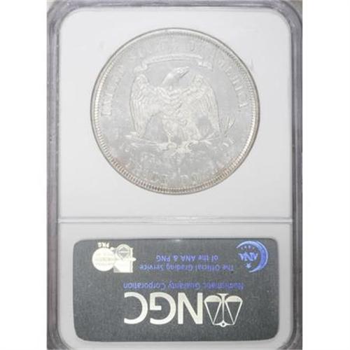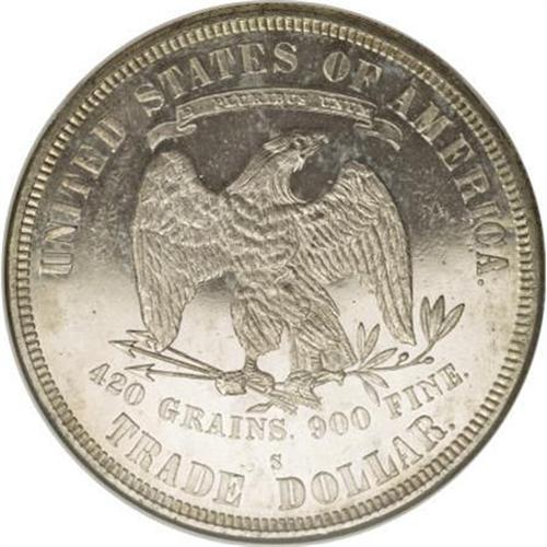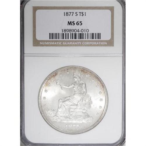 <B>1877-S T$1 MS65 NGC.</B></I> NGC has yet to certify an 1877-S Trade dollar as prooflike, but on its own, the reverse of the present piece merits a Prooflike (or perhaps even a Deep Mirror Prooflike) designation. The obverse, however, features prominent cartwheel luster. Both sides display light apricot toning near the rims. Well struck and highly attractive. Census: 30 in 65, 5 finer (10/07).<BR><I>From The Nick-A-Jack Collection.</B></I><BR><BR><B>Coin Engraver:</B> William Barber<BR><BR><b>Shipping:</b> Coins & Currency (<a target="_blank" href="http://www.heritageauctions.com/common/shipping.php">view shipping information</a>)