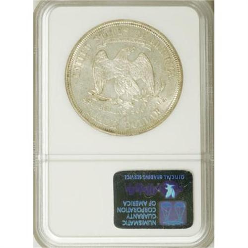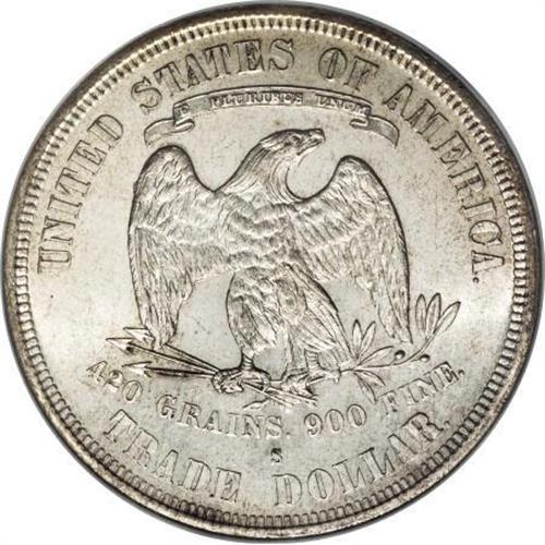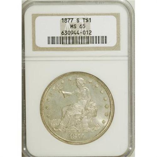 <B>1877-S T$1 MS65 NGC.</B></I> Stunning surfaces and exceptional luster are immediately evident on this prooflike Gem trade dollar. Although undesignated, the fields are fully reflective with satiny and lustrous devices. Both sides have delightful ivory color grace by accents of peripheral gold on each side. Census: 28 in 65, 5 finer (3/08).<BR><BR><B>Coin Engraver:</B> William Barber<BR><BR><b>Shipping:</b> Coins & Currency (<a target="_blank" href="http://www.heritageauctions.com/common/shipping.php">view shipping information</a>)
