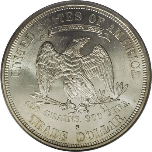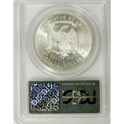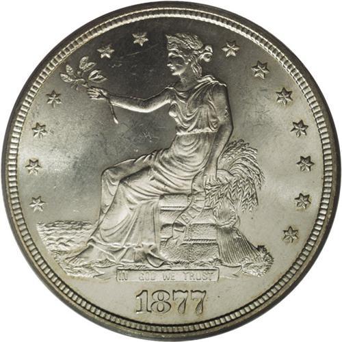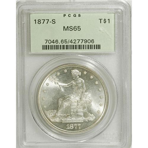 <B>1877-S T$1 MS65 PCGS.</B></I> FS-802. Large S. The lower reverse legends are clearly die doubled, most prominently on TRADE. A perusal of our Permanent Auction Archives, which date to 1991, fails to locate other pieces. A fully lustrous and brilliant Gem with well struck devices and only a few faint field marks. Housed in a green label holder. Population: 23 in 65, 7 finer (3/07).<BR><I>From The Palakika Collection.</B></I><BR><BR><b>Shipping:</b> Coins & Currency (<a target="_blank" href="http://www.heritageauctions.com/common/shipping.php">view shipping information</a>)