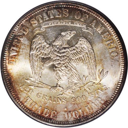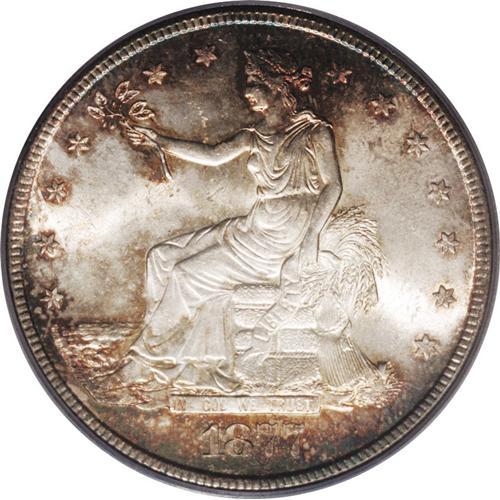 <B>1877-S<T$1> MS66 PCGS.</B></I> Type Two Obverse and Reverse. Breen-5814, Minute Mintmark. The height of the S mintmark is just under 1 millimeter in height. Both sides of this impressive Premium Gem representative exhibit dynamic cartwheel luster and are framed in colorful splashes of orange and sea-green iridescence. The striking details are well executed, with only a nominal degree of softness found on Liberty's head and surrounding stars. Despite a healthy mintage of more than 9.5 million pieces and a fairly plentiful supply of Uncirculated survivors, examples in the lofty condition are few and far between. Population: 5 in 66, 1 finer (4/06).