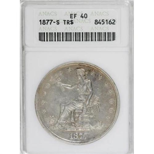 <B>1877-S T$1 XF40 ANACS.</B></I> NGC Census: (9/818). PCGS Population (26/1111). Mintage: 9,519,000. Numismedia Wsl. Price for NGC/PCGS coin in XF40: $142. (#7046)<BR><BR><B>Coin Engraver:</B> William Barber<BR><BR><b>Shipping:</b> Coins & Currency (<a target="_blank" href="http://www.heritageauctions.com/common/shipping.php">view shipping information</a>\)