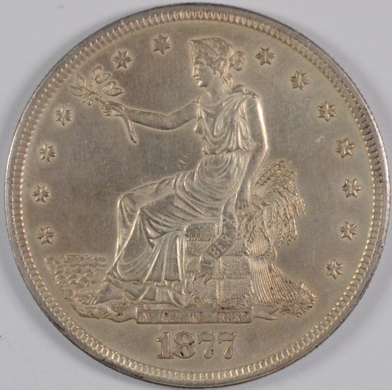 1877-S TRADE DOLLAR, MS-63 MOSTLY WHITE, A LITTLE COLOR, SEMI-PL