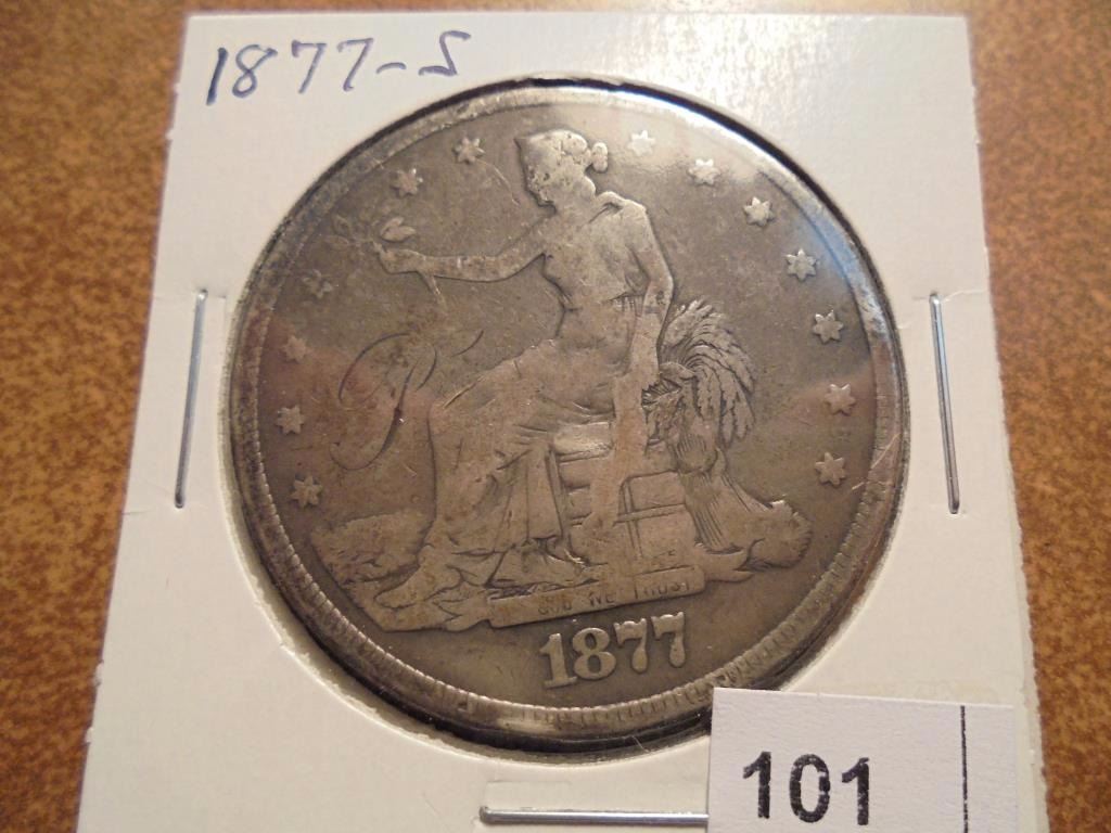 1877-S TRADE DOLLAR WITH INITIAL ON OBV.