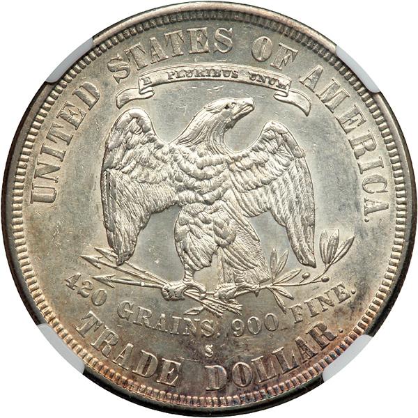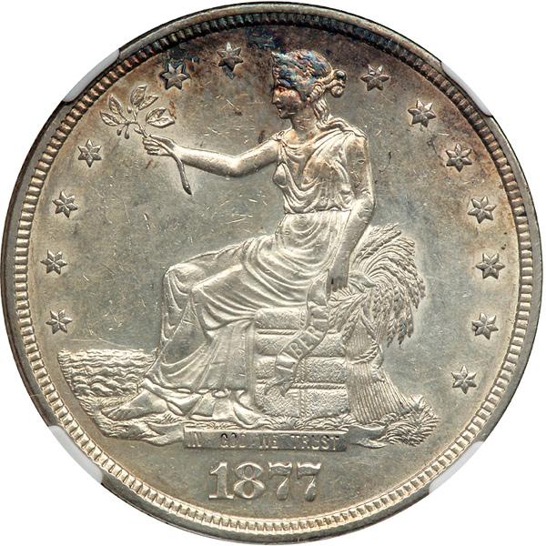 1877-S Trade Dollar. NGC graded MS-61. Some gold toning around the edges of both sides, well struck and appealing. The U.S. Trade dollar had a short if controversial run between 1873 and 1883. Attractive design.