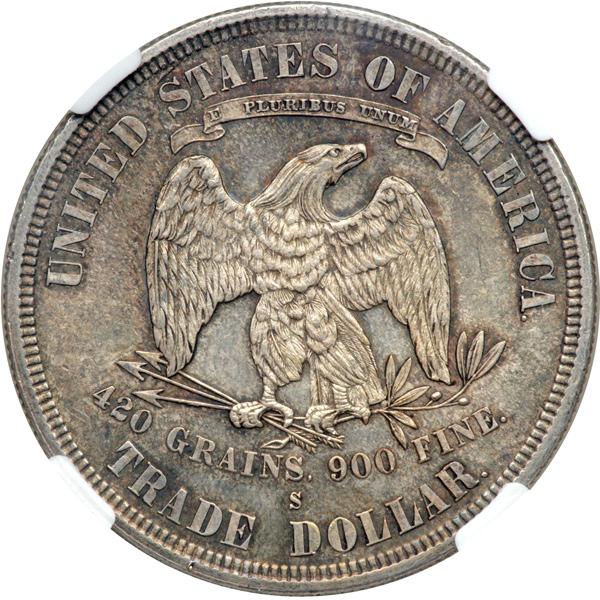 1877-S Trade Dollar. NGC graded MS-65. Evenly toned. Light to medium color visits the fields as it hugs the devices on both sides, while frost occasionally extensive flows across the field virtually unbroken by handling marks or lines. A lustrous and spectacularly preserved Gem, we are encouraged to say. The reverse appears as sharp as the obverse is also unusually clean. The quality is remarkable when one considers these were never saved by collectors in those days who, when the opportunity arose, opted for the Proofs. The present '77-S belongs in a first-class Trade Dollar collection where its Gem level can be appreciated all the more. Pop 27; 5 finer, 4 in 66, 1 in 67.