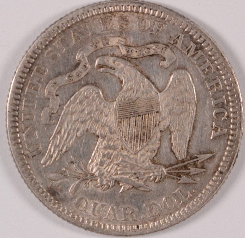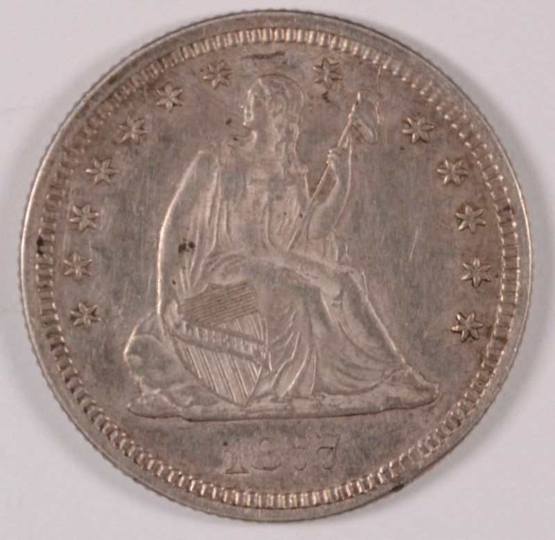 1877 SEATED LIBERTY QUARTER, AU-58 LIGHT TONE