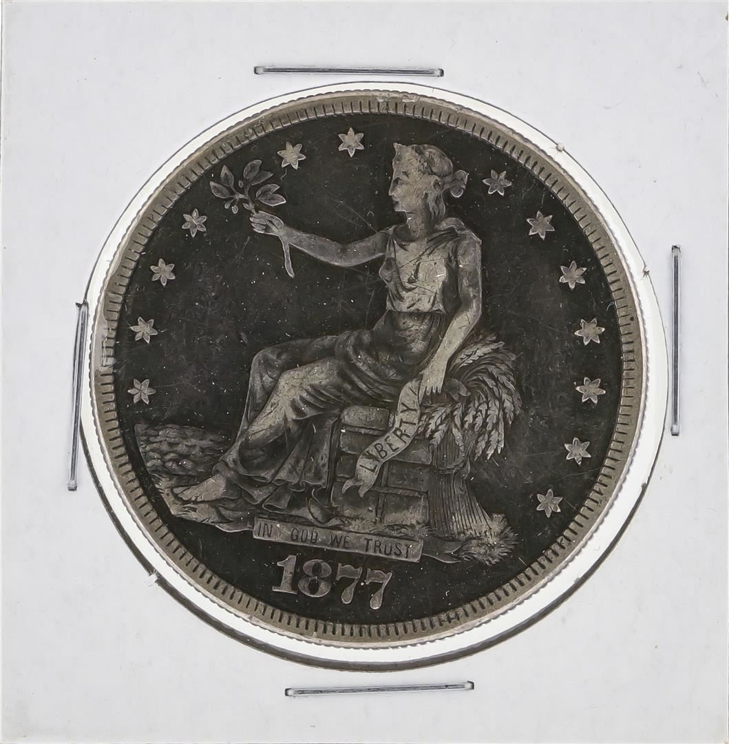 One 1877 Seated Liberty Trade Dollar Coin.