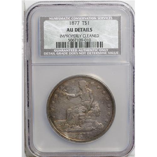 <B>1877 T$1 --Improperly Cleaned--NCS. AU Details.</B></I> NGC Census: (10/292). PCGS Population (14/293). Mintage: 3,039,710. Numismedia Wsl. Price for NGC/PCGS coin in AU50: $225. (#7044)<BR><BR><b>Shipping:</b> Coin/Currency (<a target="_blank" href="http://www.heritageauctions.com/common/shipping.php">view shipping information</a>)