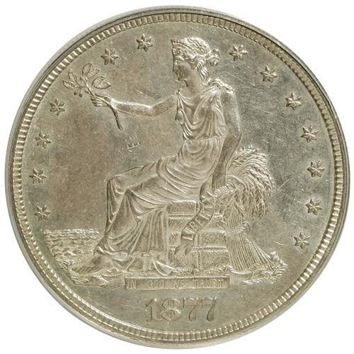 <B>1877 T$1 AU58 PCGS.</B></I> PCGS Population (38/201). NGC Census: (42/227). Mintage: 3,039,710. Numismedia Wsl. Price for NGC/PCGS coin in AU58: $350. (#7044)<BR><BR><b>Shipping:</b> Coins & Currency (<a target="_blank" href="http://www.heritageauctions.com/common/shipping.php">view shipping information</a>)