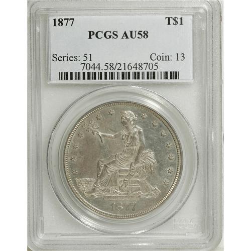 1877 T$1 AU58 PCGS. PCGS Population (38/201). NGC Cens