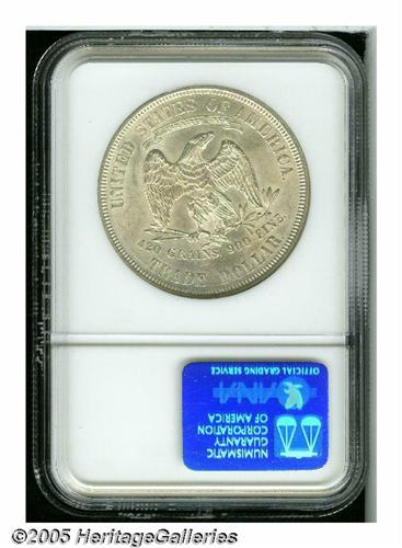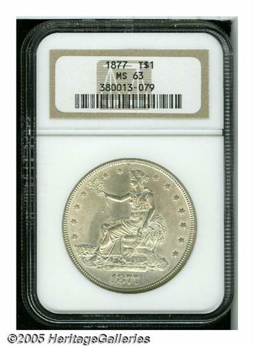 1877 T$1 MS63 NGC. Boldly struck, with minor soft