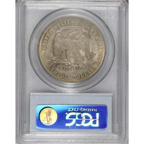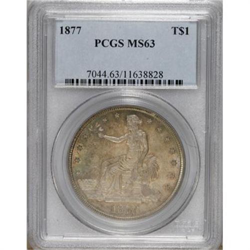<B>1877 T$1 MS63 PCGS.</B></I> Original toning across both sides varies from light-gray to aqua to pastel orange. The coin displays excellent luster for a Trade dollar. The striking details are also better than average for the type, with the only noticeable weakness appearing on Liberty's head and on the eagle's right (facing) talons. Small abrasions on Liberty's neck and just to the left of her knee limit the grade of this appealing example. Population: 50 in 63, 64 finer (4/07). <BR><BR><b>Shipping:</b> Coins & Currency (<a target="_blank" href="http://www.heritageauctions.com/common/shipping.php">view shipping information</a>)