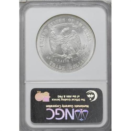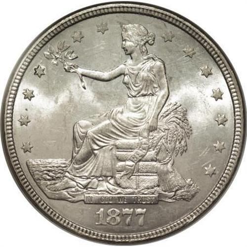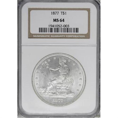 <B>1877 T$1 MS64 NGC.</B></I> The satiny surfaces show occasional blushes of reddish-tan toning in selected areas. Though the strike shows typical softness at the margins, the remaining design elements are solidly impressed. Just a few minor marks are noted on Liberty's cheek, neck, and left arm. The left (facing) obverse field also exhibits some unobtrusive scuffs and slide marks. This issue of just over 3 million pieces is highly challenging in Mint State, and attractive Choice coins seldom appear at auction. NGC has graded only nine numerically finer pieces (1/08).<BR><BR><B>Coin Engraver:</B> William Barber<BR><BR><b>Shipping:</b> Coins & Currency (<a target="_blank" href="http://www.heritageauctions.com/common/shipping.php">view shipping information</a>)