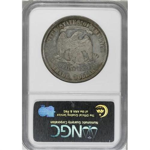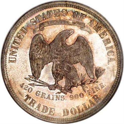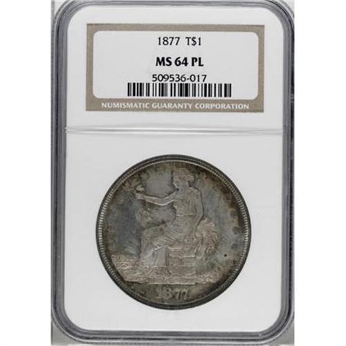 <B>1877 T$1 MS64 Prooflike NGC.</B></I> Breen-5807, the bases of 18 touch. Many 1877 Trade dollars are found chopmarked, and few have survived in high grades. This especially attractive example displays bright, prooflike fields on each side. This brightness is evident even through the substantial rose and peripheral blue toning seen over both obverse and reverse. Softly struck on the head of Liberty and stars, as almost always seen. One of only two Prooflike 1877 Trade dollars certified by NGC (both MS64), with none finer (2/08).<BR><I>From The Queller Family Collection of Silver Dollars.</B></I><BR><BR><B>Coin Engraver:</B> William Barber<BR><BR><b>Shipping:</b> Coins & Currency (<a target="_blank" href="http://www.heritageauctions.com/common/shipping.php">view shipping information</a>)