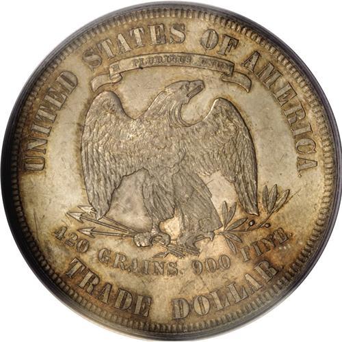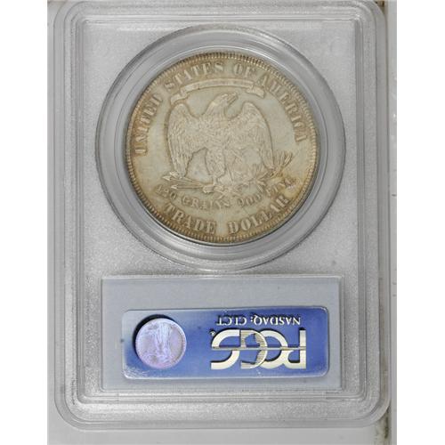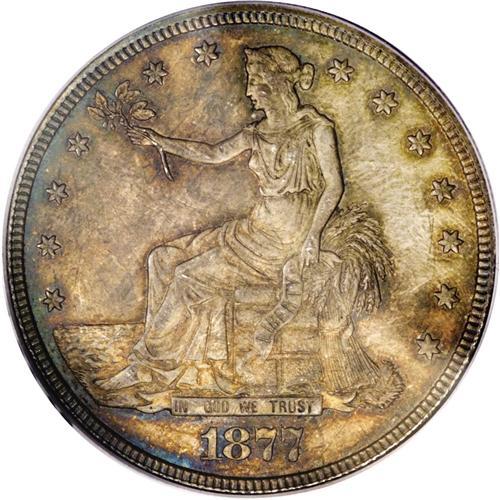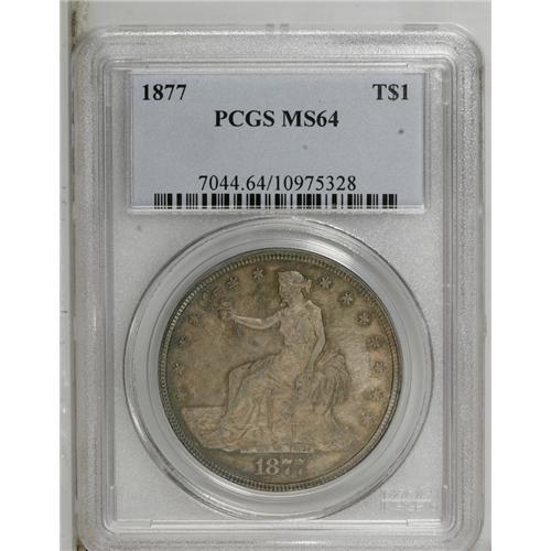 <B>1877 T$1 MS64 PCGS.</B></I> Rich sea-green and golden-brown toning embraces this shimmering trade dollar. Well struck despite the usual minor blending of detail on the right (facing) claw. Moderate marks are noted above the extended arm and the arrow shafts. Population: 58 in 64, 3 finer (11/06).<BR><BR><b>Shipping:</b> Coin/Currency (<a target="_blank" href="http://www.heritageauctions.com/common/shipping.php">view shipping information</a>)