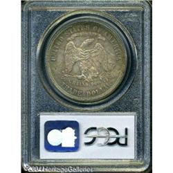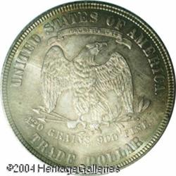 1877 T$1 MS64 PCGS. Satiny and wholly original, be <B>1877 T$1 MS64 PCGS.</B></I> Satiny and wholly original, being endowed with rich olive-gold, apricot, and mint-green toning that in no way compromises the underlying luster. The strike is a tad soft in the vicinity of Liberty's head, a feature common to this issue. Only a single piece has been graded finer, by PCGS (10/04). <BR><BR><B>Important notice:</B> Heritage usually auctions material at the rate of 200-250 lots per hour. On some occasions eBay Live bid software or the Internet may not be able to keep up with the pace of the auction. We recommend placing a realistic absentee bid now as insurance to avoid disappointment. Occasionally the auctioneer may eliminate or reject an eBay Live bid, and the auctioneer may also reopen a lot after the close of the eBay live bidding (usually because we missed an audience bid), and may reject your bid even if it shows you as the winning bidder. By bidding via eBay Live, you agree that Heritage may award the lot to another bidder at its sole discretion under the circumstances described above or any other reasonable circumstances. Since eBay bids are not shown to us until we open the lot on the floor, we treat those bids just like floor bids. In most cases the floor responds before the eBay bid is presented to us, due to Internet lag time, so for consistency we have made it a policy that floor bids are always considered first over tie eBay live bids. Also please note that all Heritage lots purchased through eBay Live carry a 20% Buyer's Premium. Please make sure you read the Terms and Conditions before you bid. This lot is being auctioned in conjunction with a live floor auction by Heritage Galleries & Auctioneers. All final auction and invoice information will be supplied by Heritage Galleries & Auctioneers, and all other information should be considered preliminary. Lot:6408