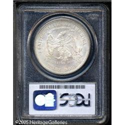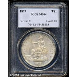 <B>1877 T$1 MS64 PCGS.</B></I> Satiny luster throughout and bathed in a blush of light gold toning. The strike typically soft at the periphery, with most of the stars lacking their central lines. the important central devices are sharp, including the feathers on the eagle. A very difficult coin to locate with so few signs of handling, and this one should suit most date collectors who demand lofty grades. Population: 53 in 64, 1 finer (1/05). Lot:7423